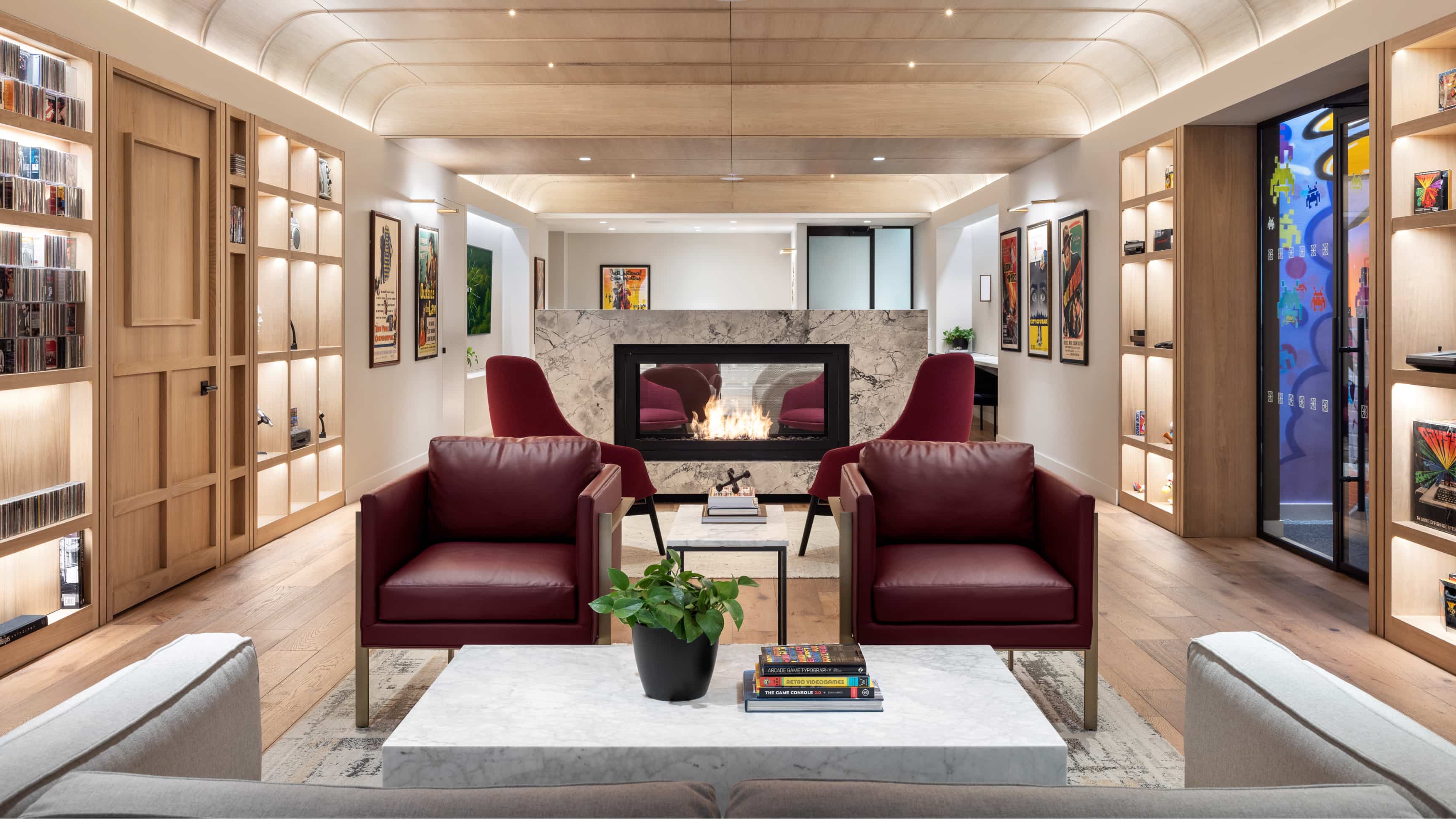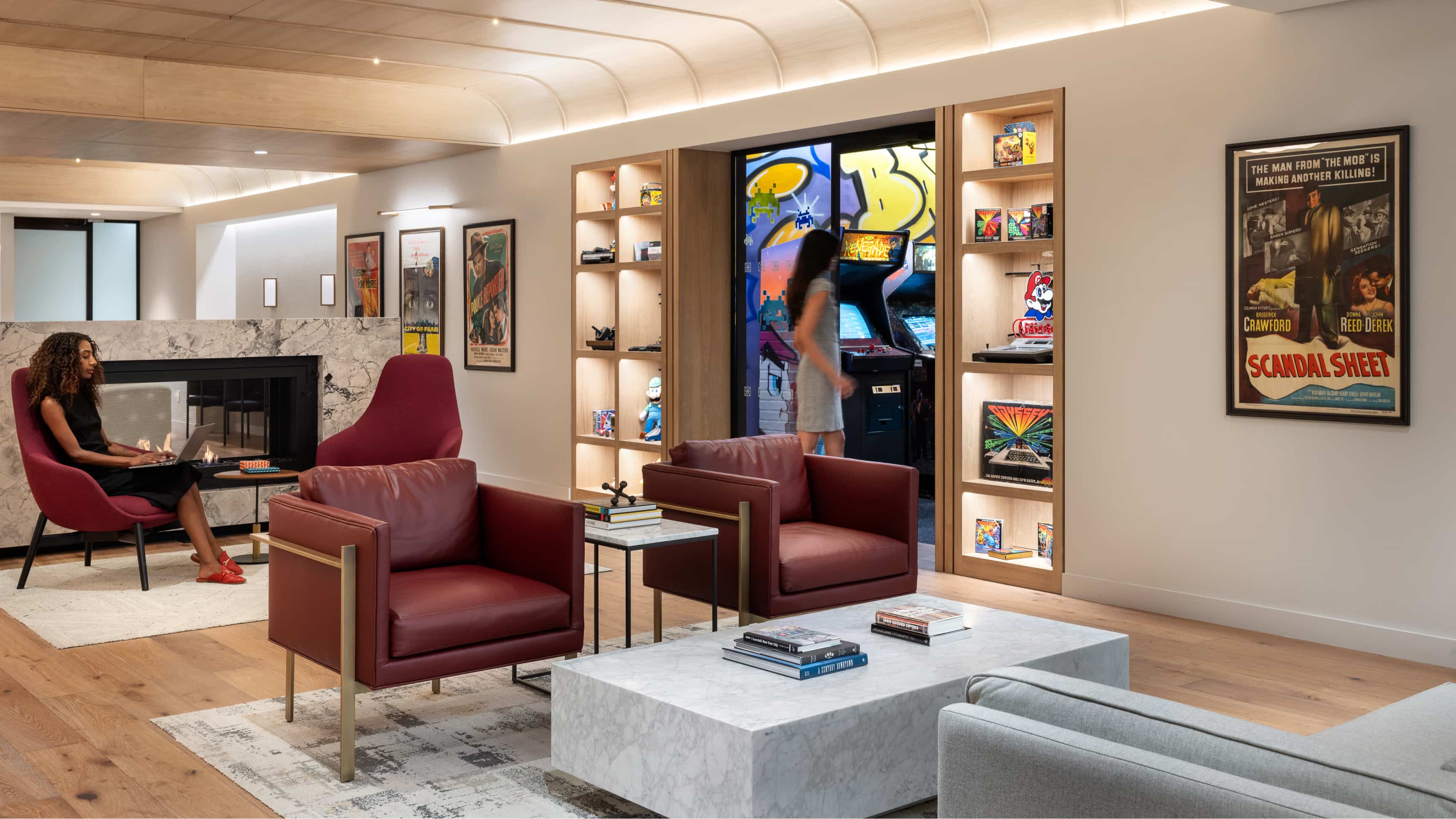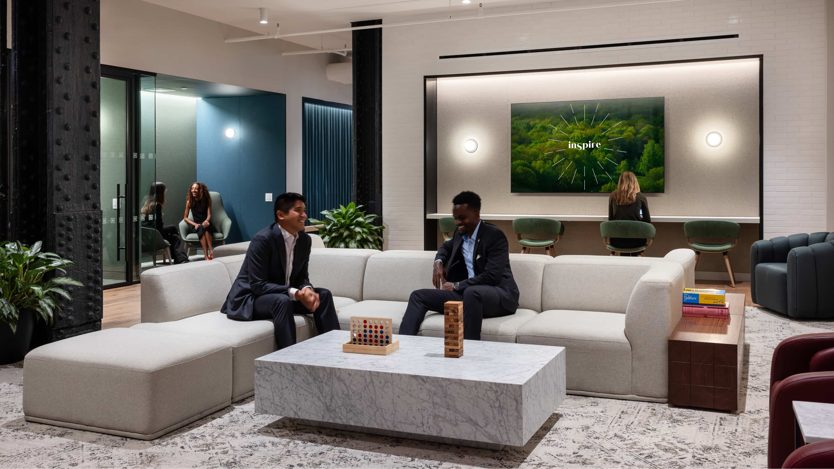 A beautifully appointed lounge with comfortable seating areas, an arcade, a secret speakeasy for Inspire members, and more.