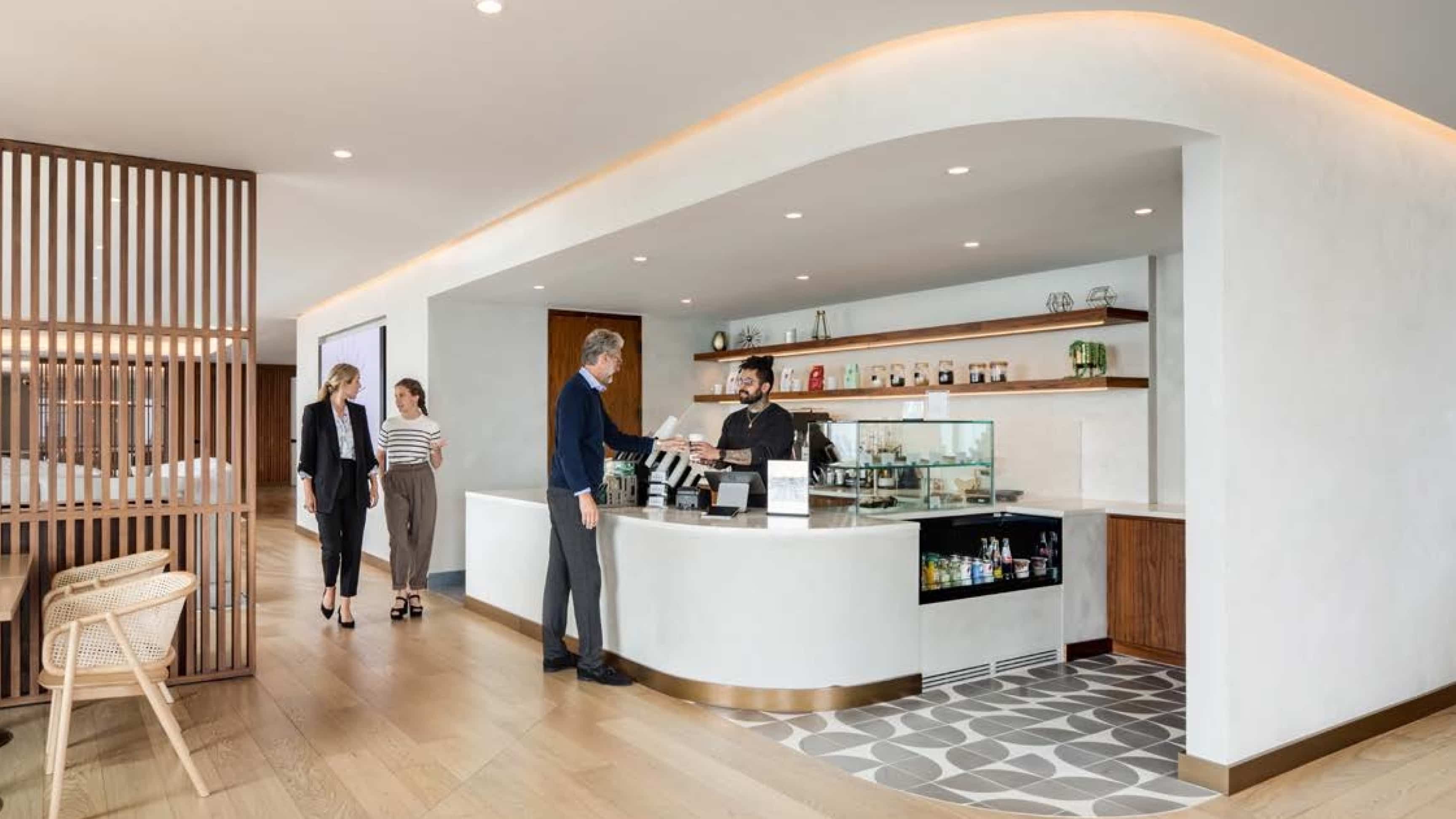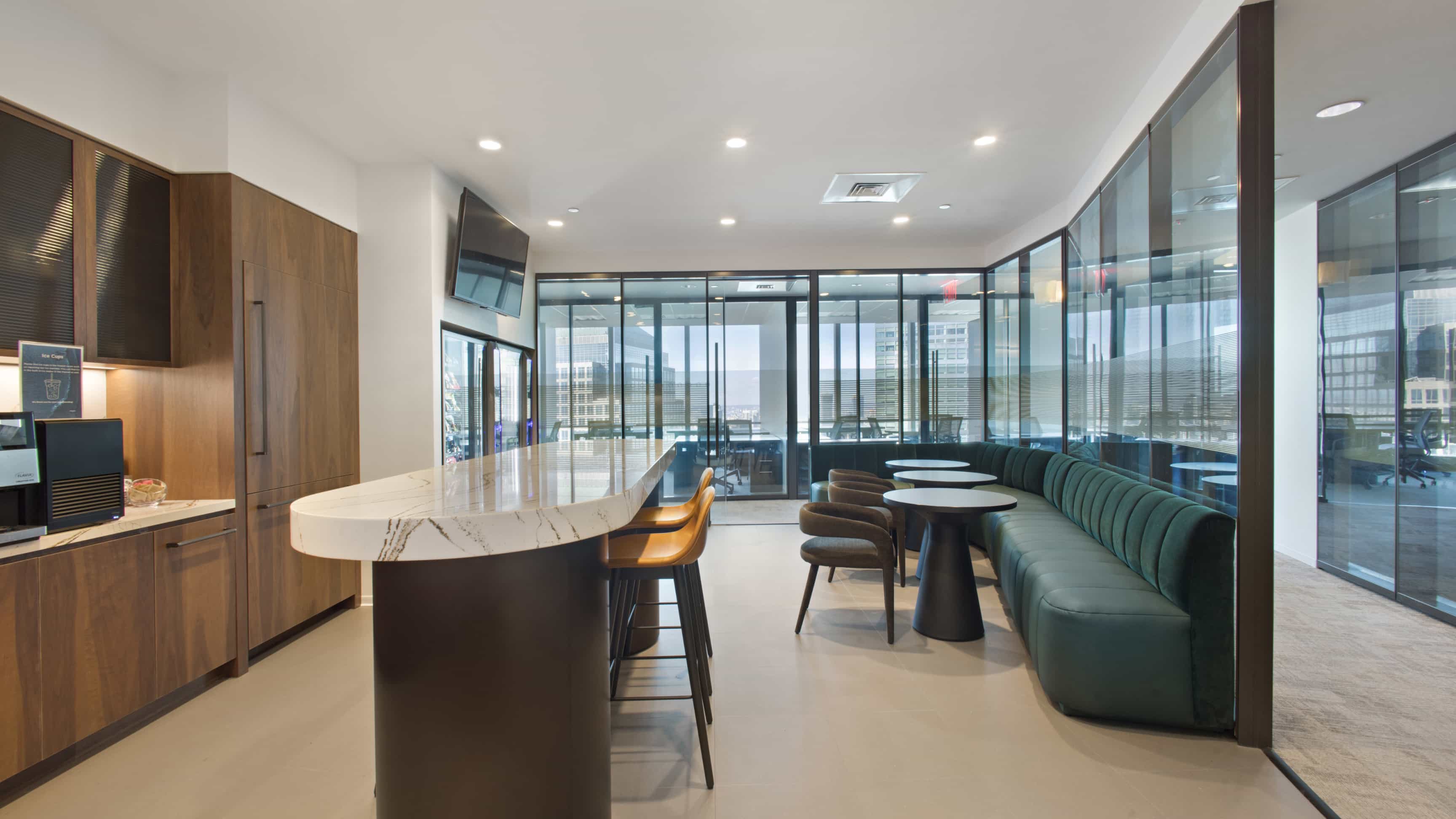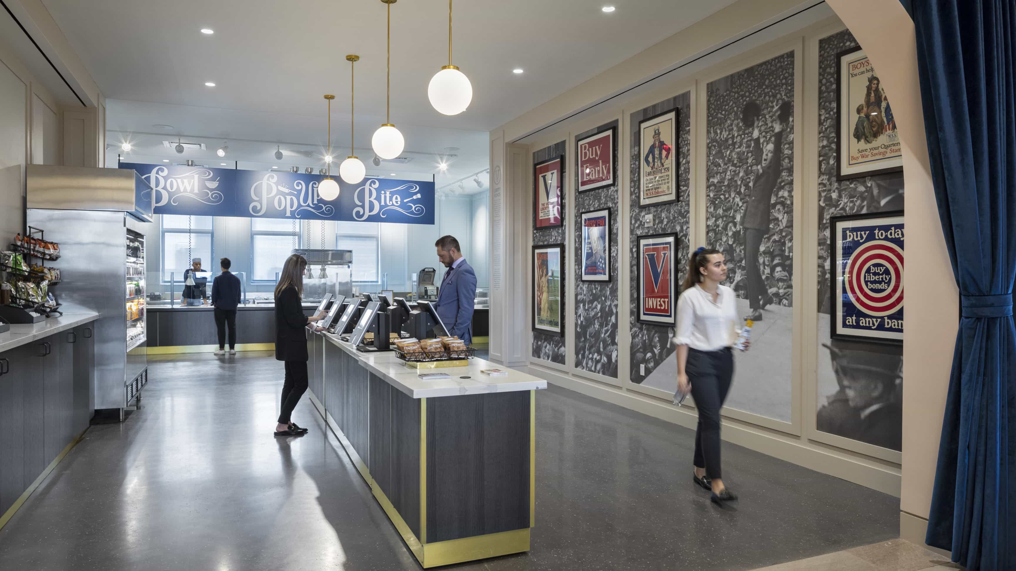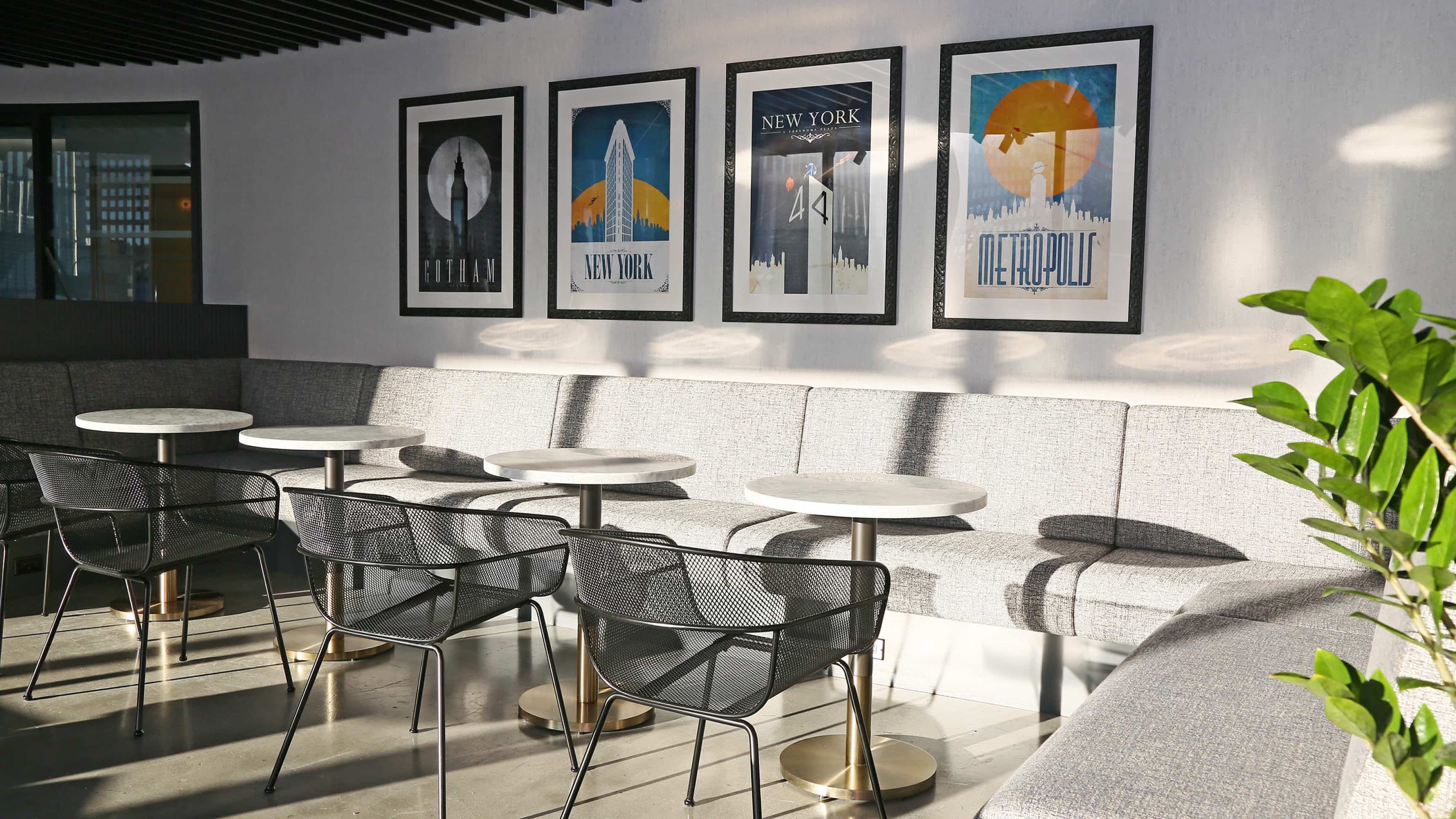 Exclusively for tenants, the Amenities space on the 10th Floor of 7 WTC offers a large, comfortable lounge area, and a café.