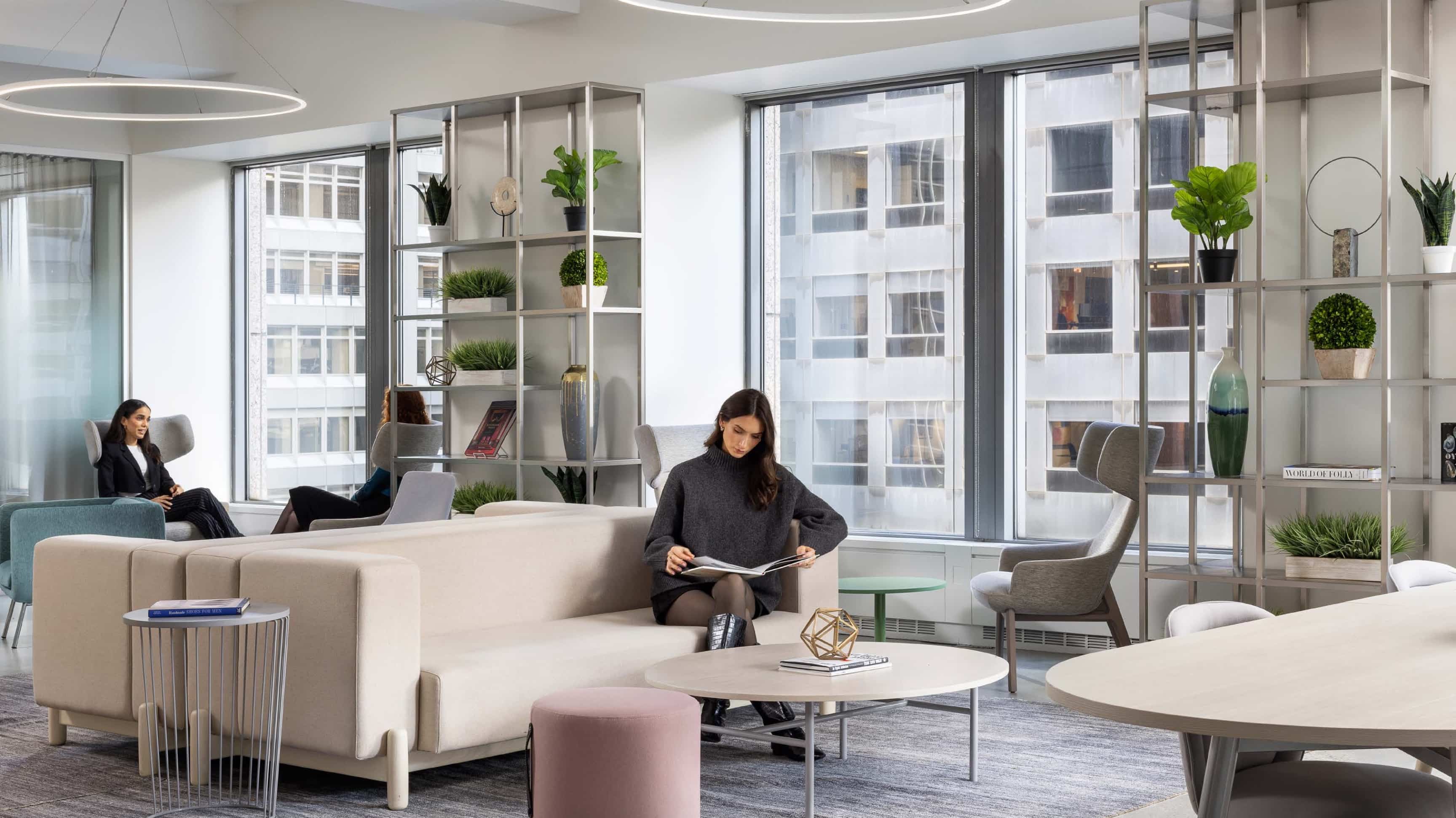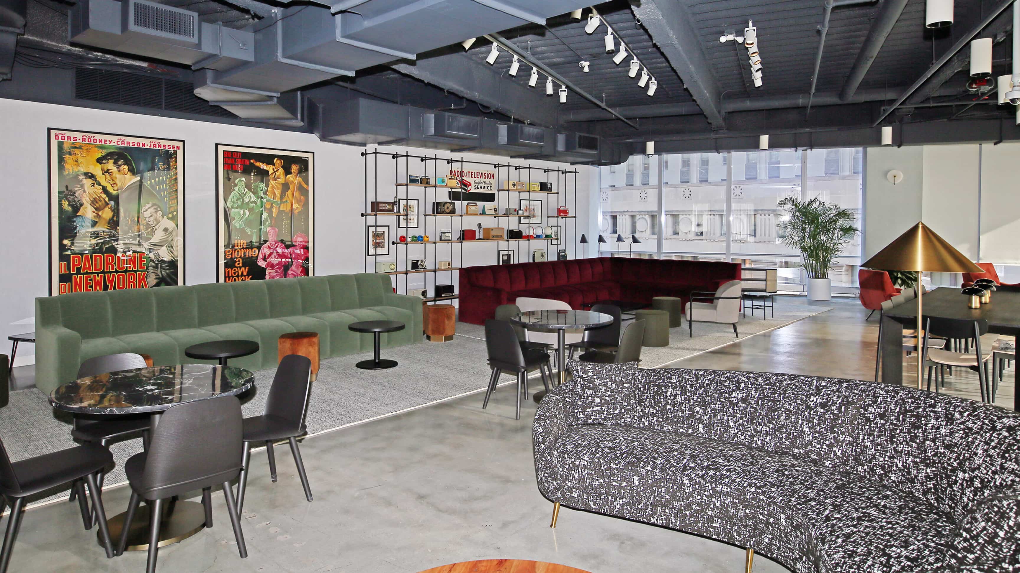 A bright 17th Floor Lounge in the heart of midtown Manhattan that offers high tech conference rooms, comfy seating, classes, and lectures.